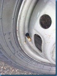 It wasn’t long after they’d jacked up the RV that the problem was found. There was a hole in the metal valve stem extender. It had obviously been rubbing on the rim since it was installed 8000 miles ago and wore a hole clean through the metal. Then, all the air came out of the tire. I should have taken a picture of the hole in the valve stem but I didn’t.